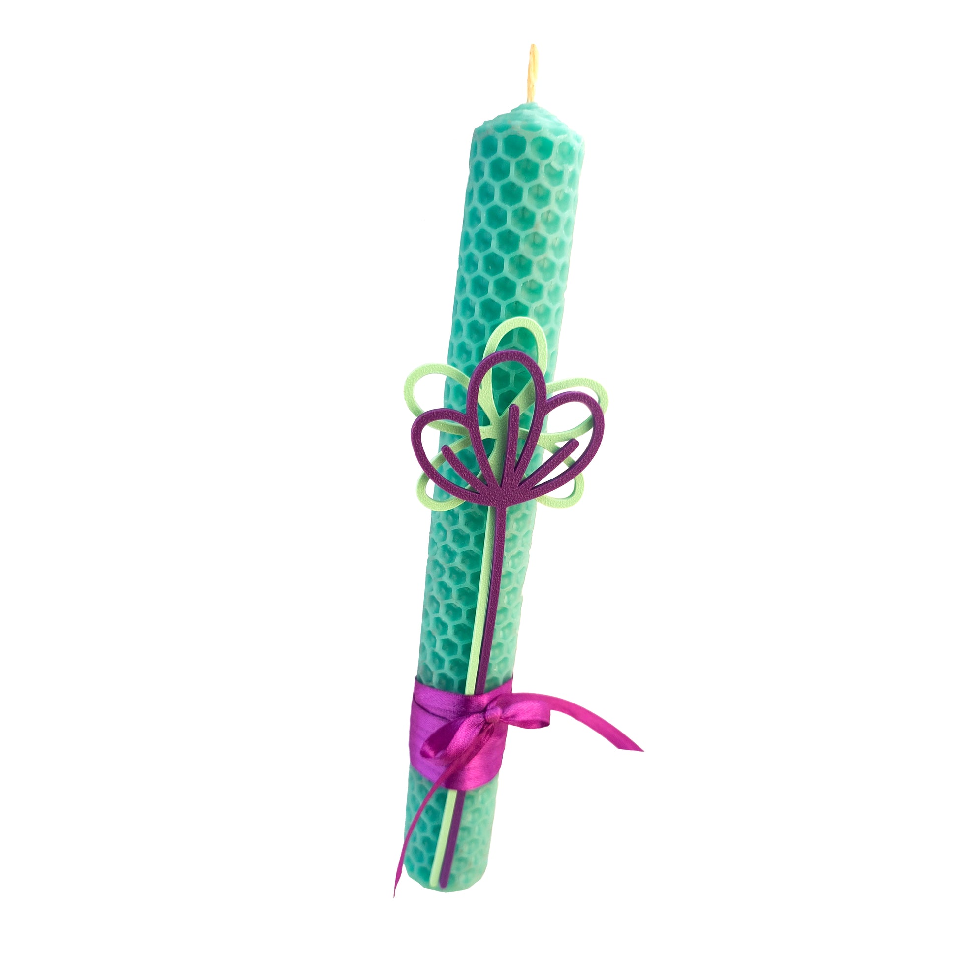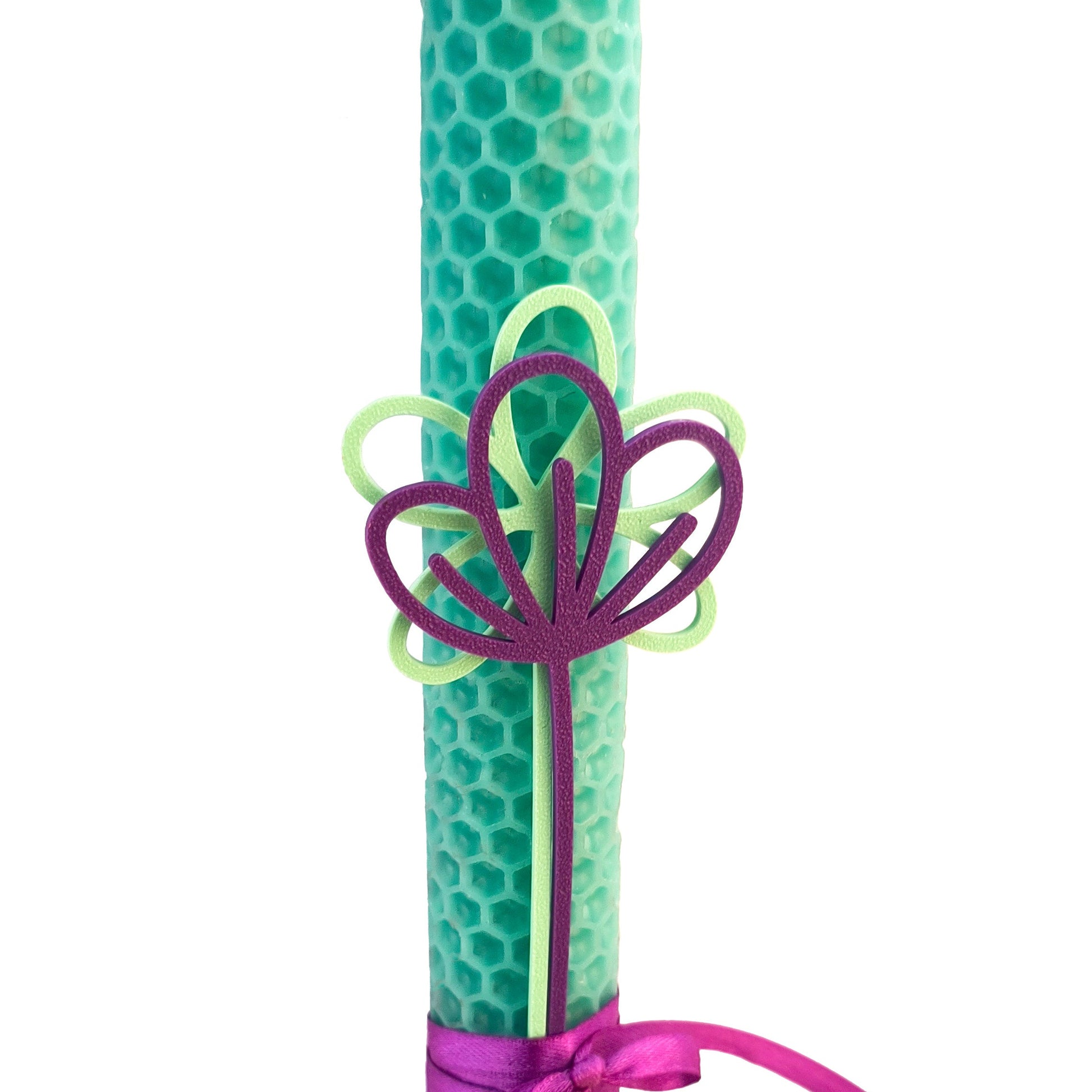 Λαμπάδα με λουλούδια από 3διάστατη εκτύπωση σε χειροποίητο κερί μέλισσας σε απόχρωση τυκρουάζ.