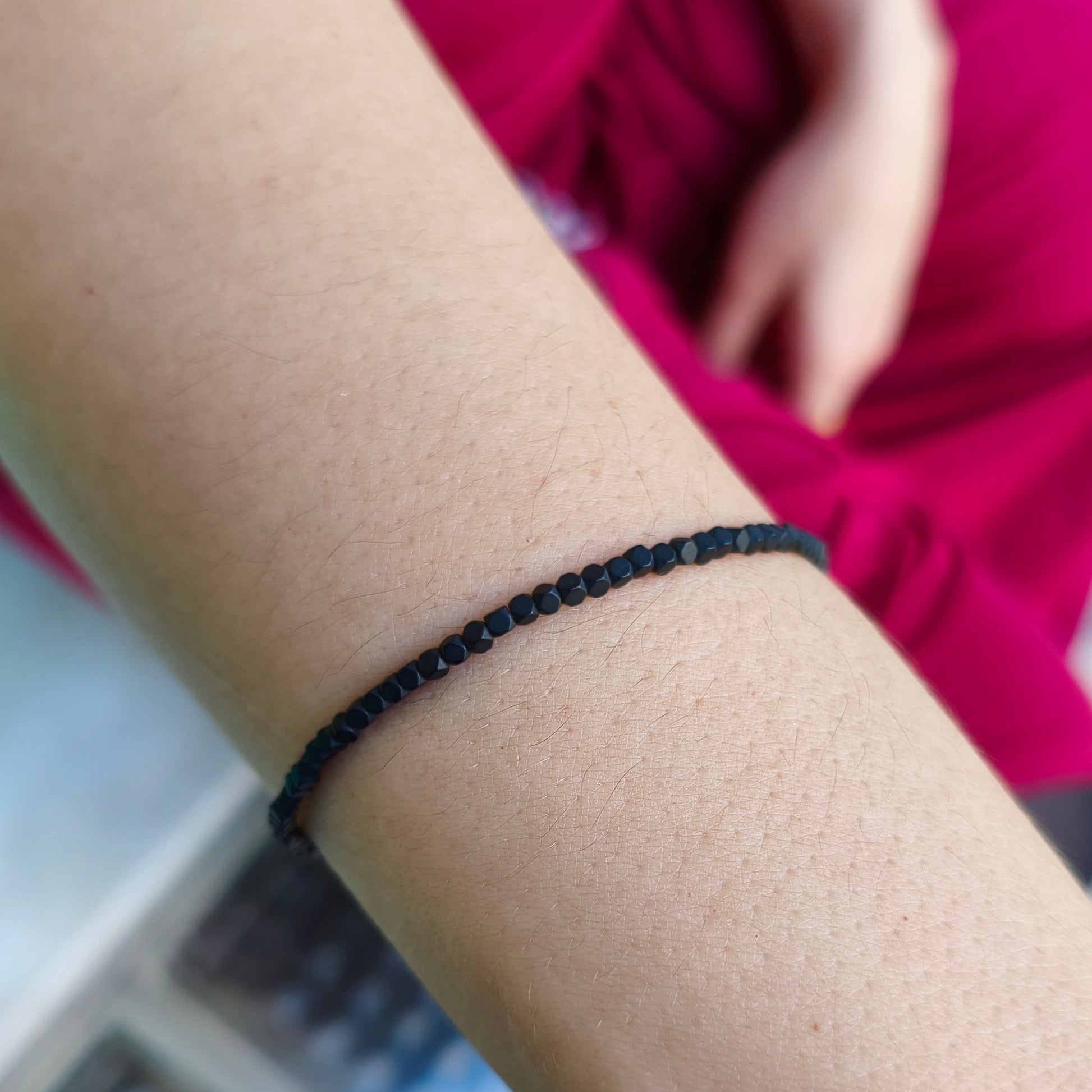 Βραχιόλι με μαύρο όνυχα σε σχήμα κύβο 2 χιλ., δεμένο με ατσαλόσυρμα και ασημένιο επιπλατινωμένo κούμπωμα & αλυσίδα για αυξομείωση.
