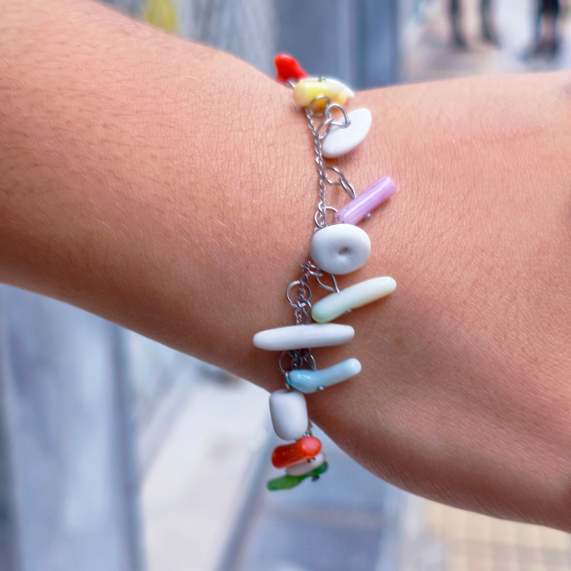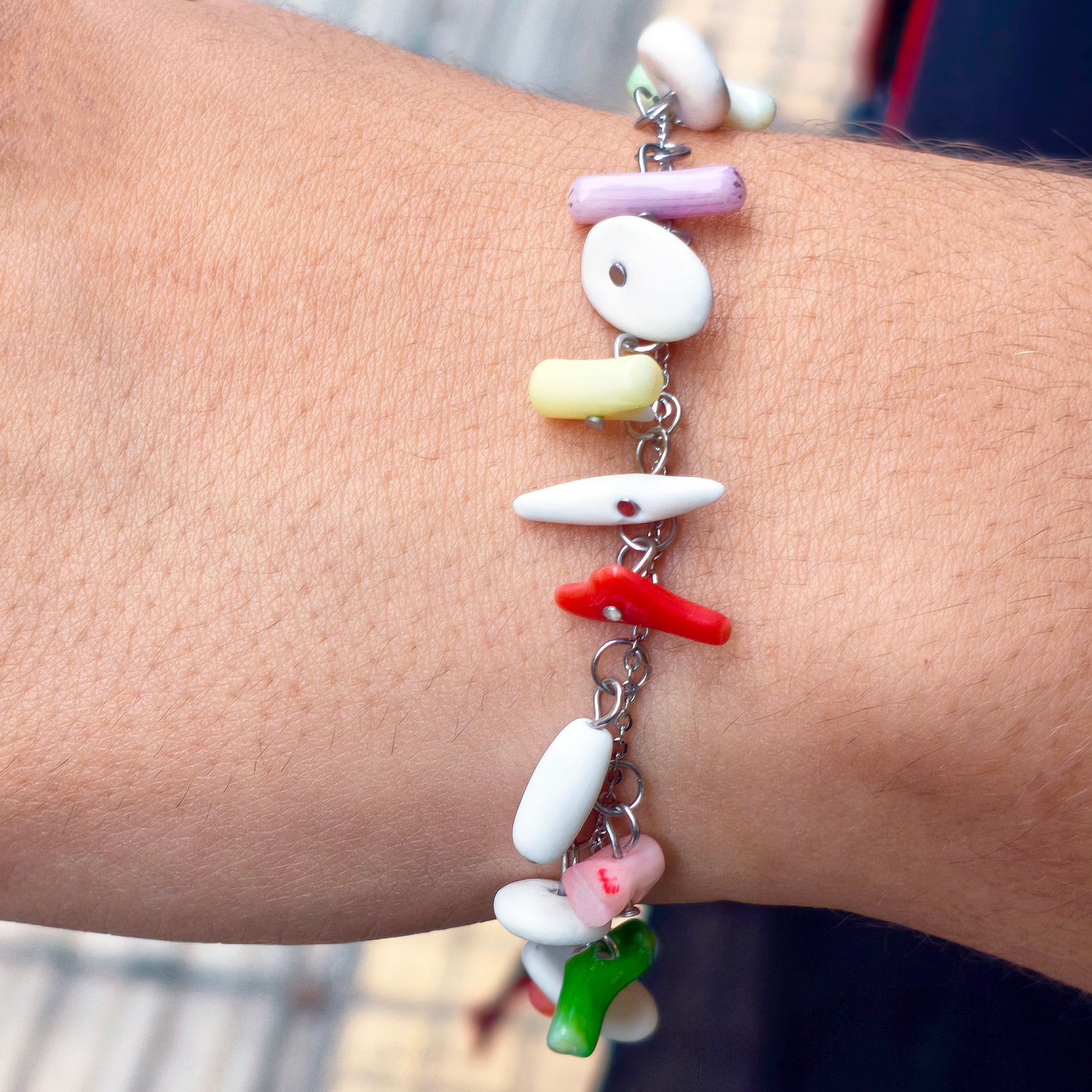 Βραχιόλι χειροποίητο από εξαιρετικής ποιότητας λευκή πορσελάνη, ψημένη σε καμίνι, σε θερμοκρασία 1240°C, σε συνδυασμό με κοράλλια & ημιπολύτιμους λίθους και το κούμπωμα είναι από ανοξείδωτο ατσάλι.