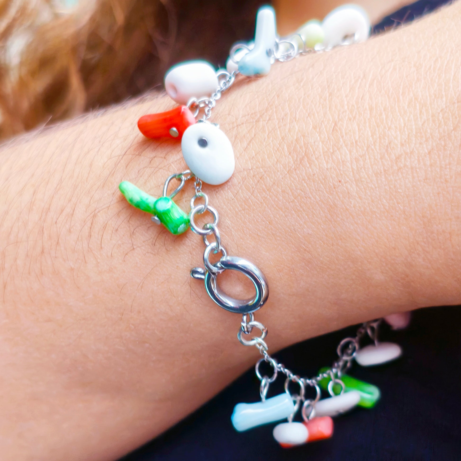 Handmade bracelets with high quality white porcelain cooked in kiln at 1240°C, with corals & semiprecious stones and stainless steel clasp.