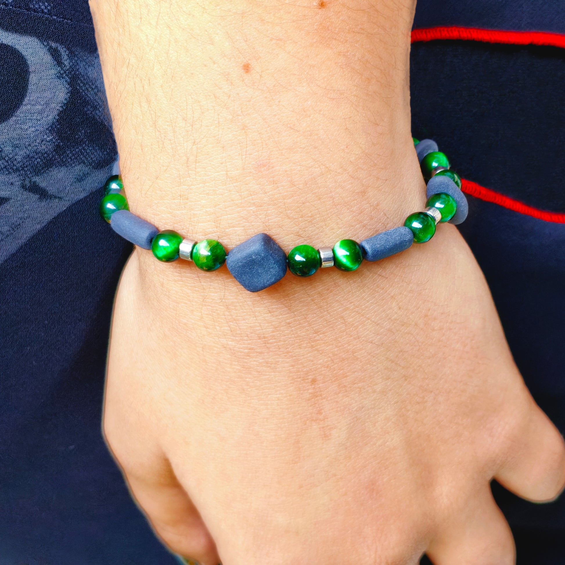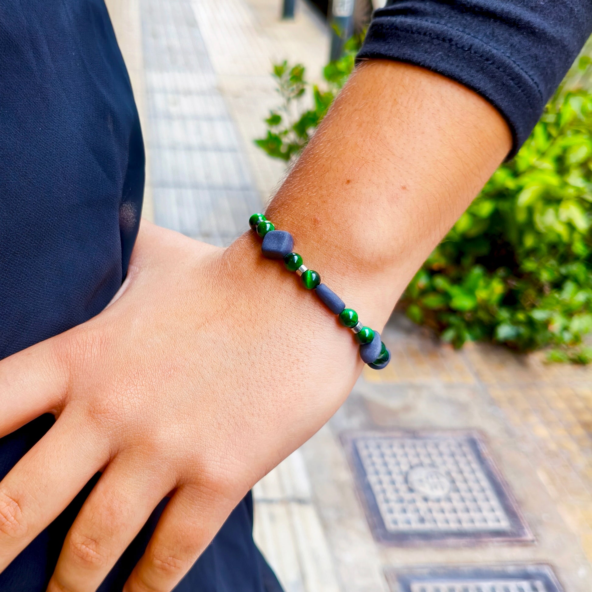 Βραχιόλι χειροποίητο από εξαιρετικής ποιότητας μαύρη πορσελάνη, ψημένη σε καμίνι, σε θερμοκρασία 1240°C, σε συνδυασμό με πράσινο μάτι γάτας και το κούμπωμα είναι από ανοξείδωτο ατσάλι.