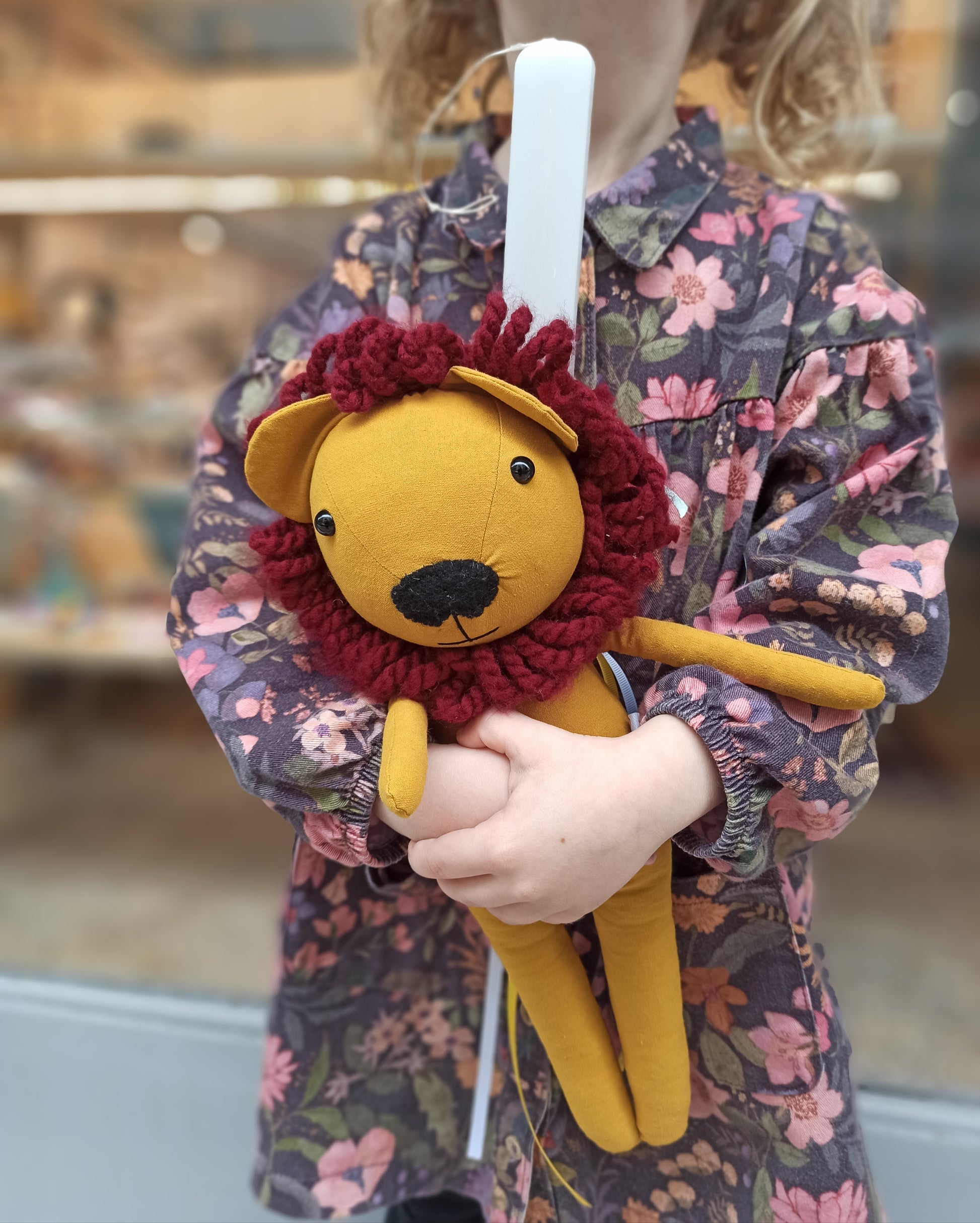 Ένα εντυπωσιακό αλλά χαριτωμένο λιονταράκι στολίζει αυτή τη λαμπάδα έτοιμο να "επιτεθεί" με αγκαλιές.