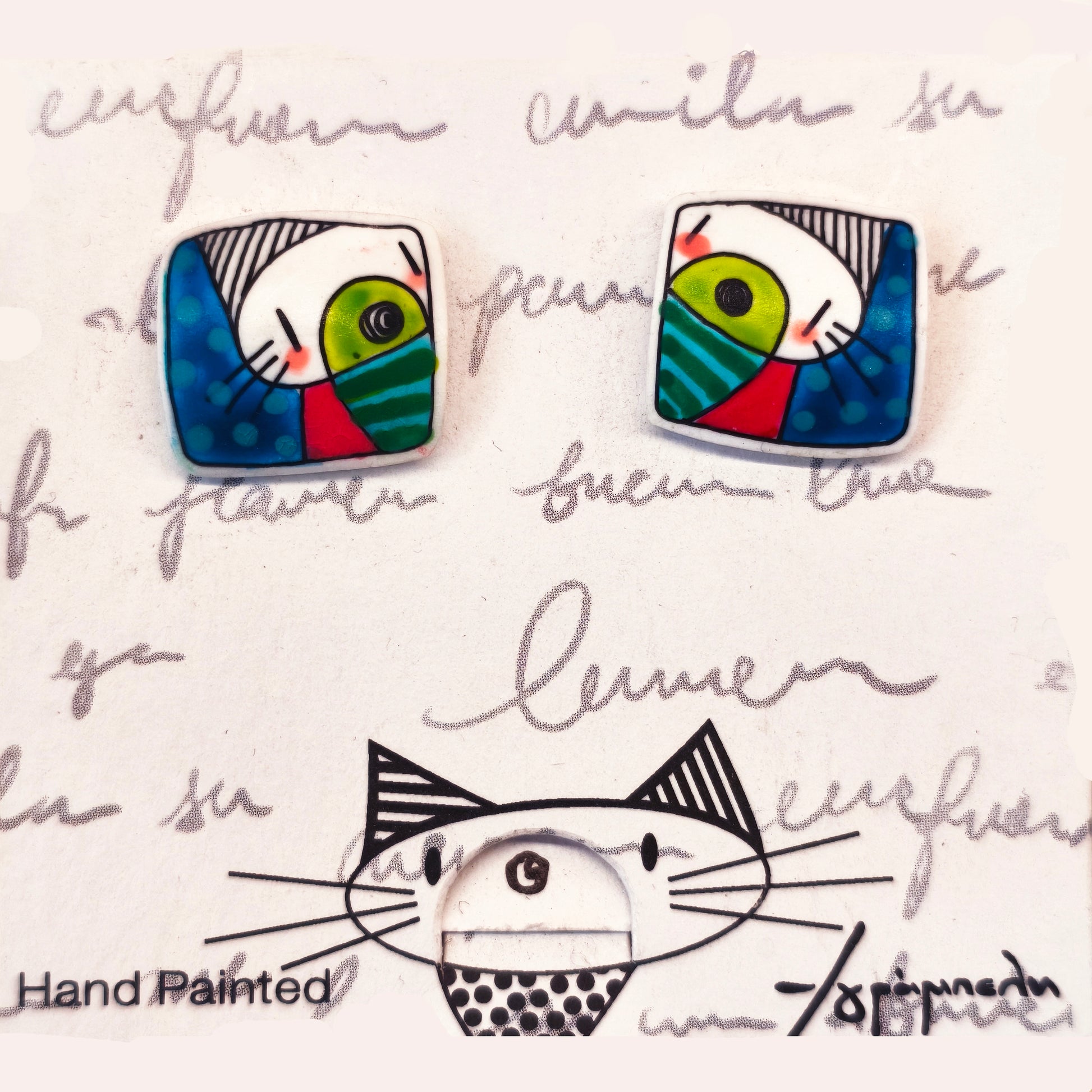 Σκουλαρίκια γάτες , καρφάκια από shrink plastic, ζωγραφισμένα στο χέρι.