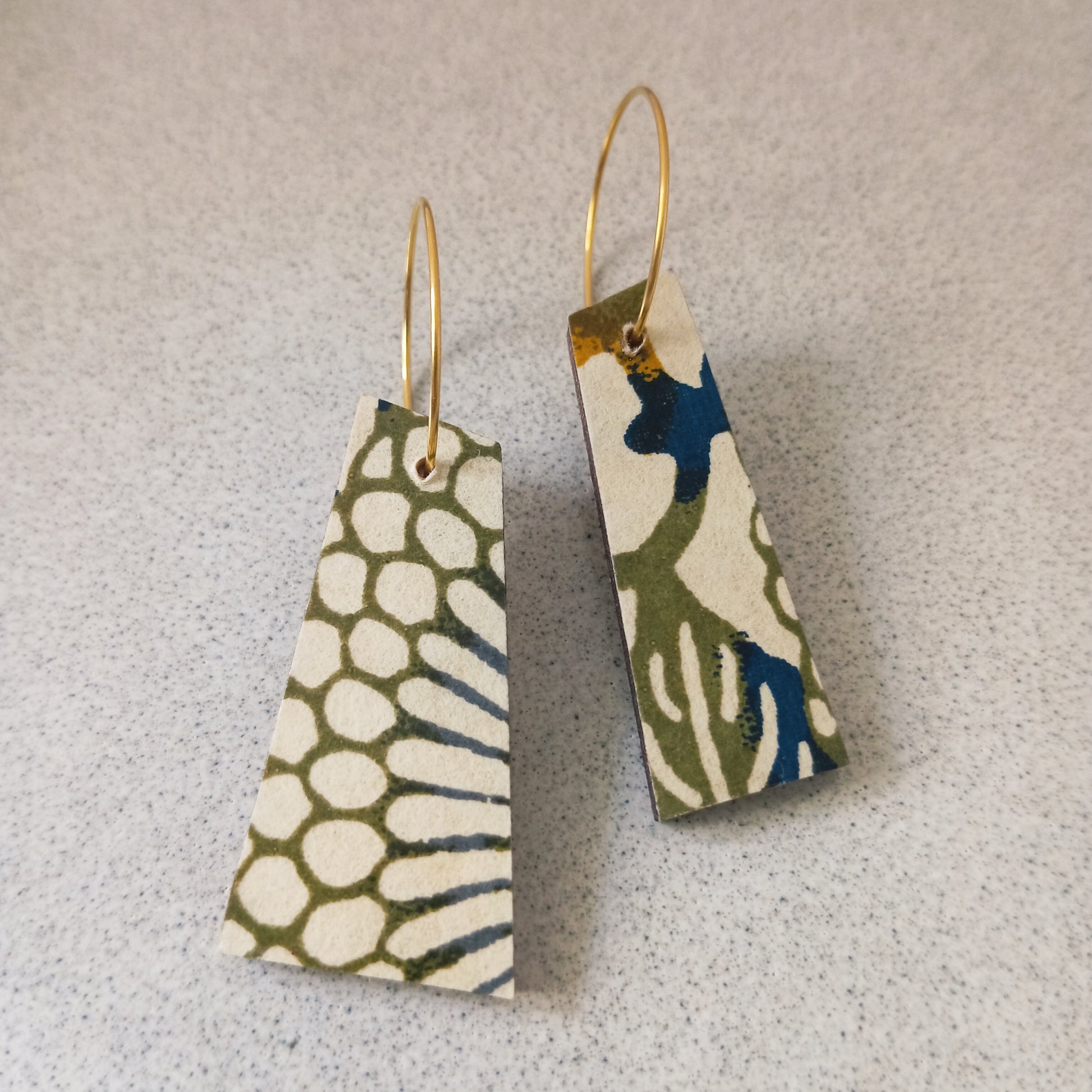 Wooden earrings & finest Japanese paper, with a beautiful blue-green chrysanthemum pattern. The earrings have different sizes & the hoops are gold-plated stainless steel.