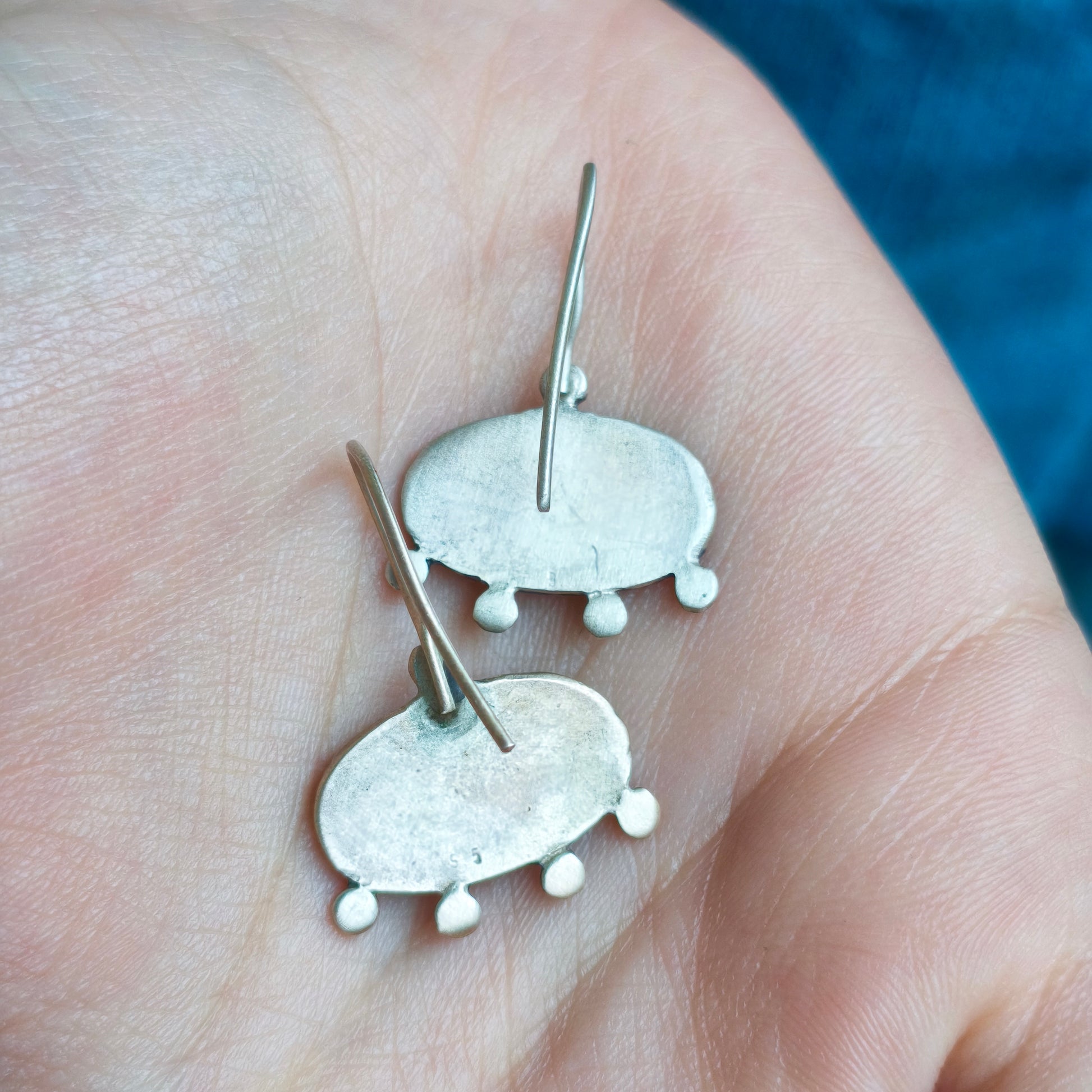 Silver earrings, hooks with green enamel.