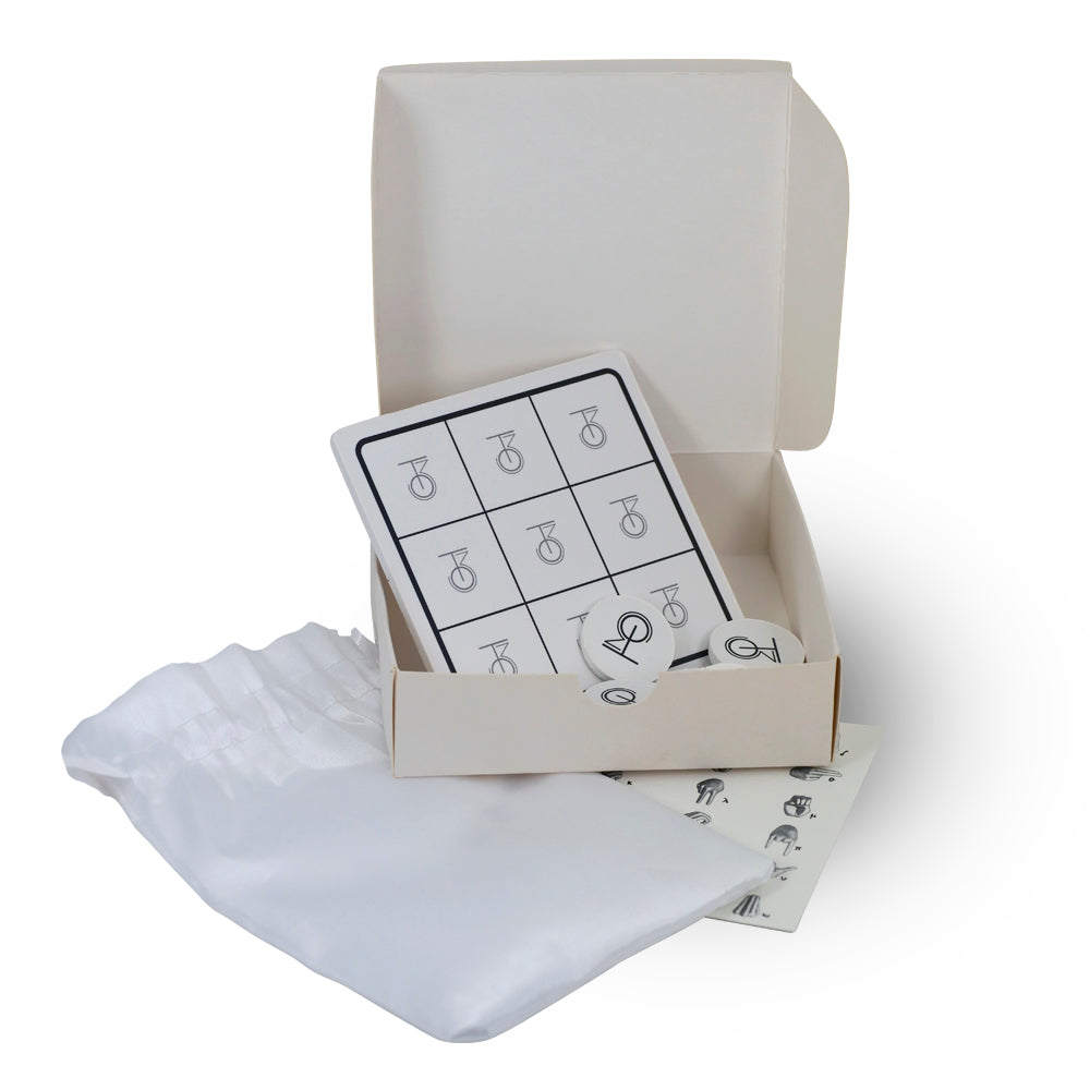 1 βάση Τρίλιζας 10x10 εκ.,10 πιόνια (5 Όμικρον & 5 Χι), 1 Αλφαβήτα στην ΕΝΓ & τους κανόνες του παιχνιδιού.