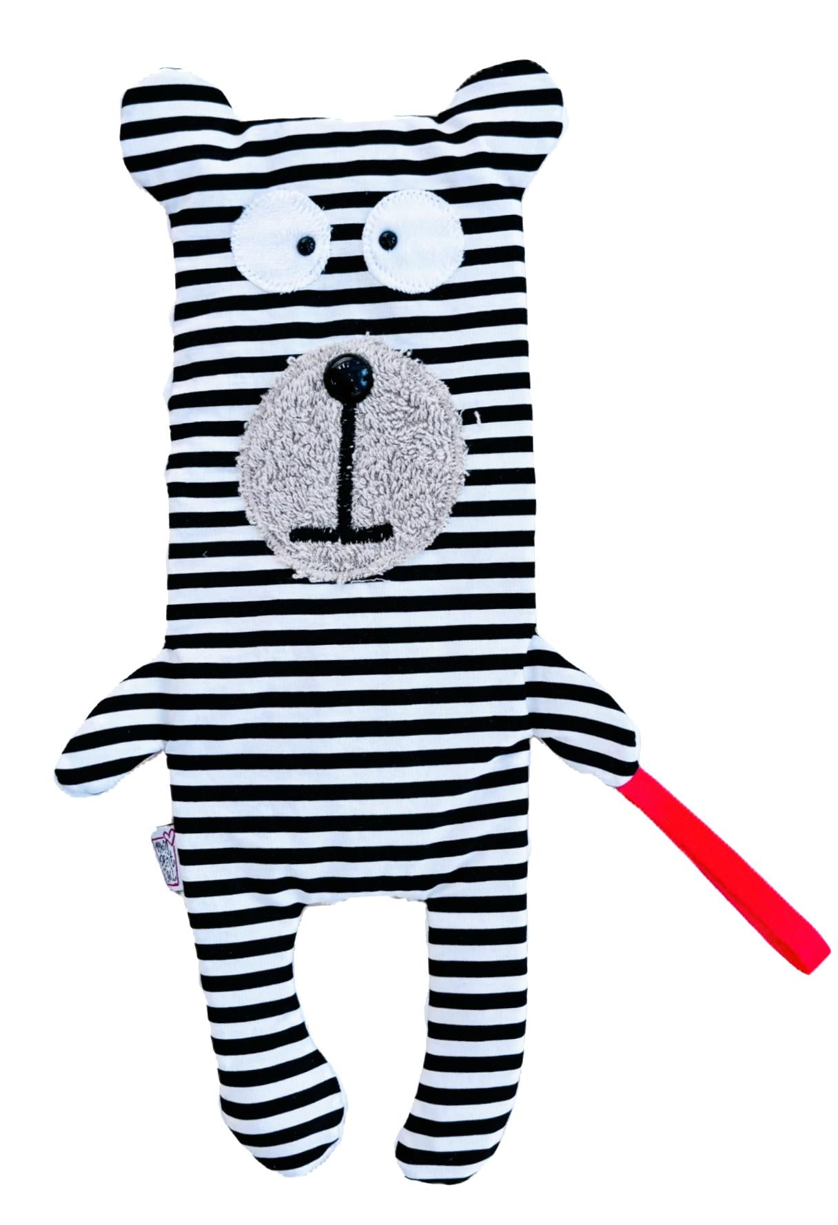 Με ύψος 33 εκατοστά, είναι ιδανικό για μικρά χεράκια και διαθέτει διπλή υφή για εξερεύνηση: η μία πλευρά είναι από 100% βαμβακερό ύφασμα (ριγέ ασπρόμαυρο) και η άλλη από απαλό ύφασμα minky, προσφέροντας ποικιλία αισθήσεων.