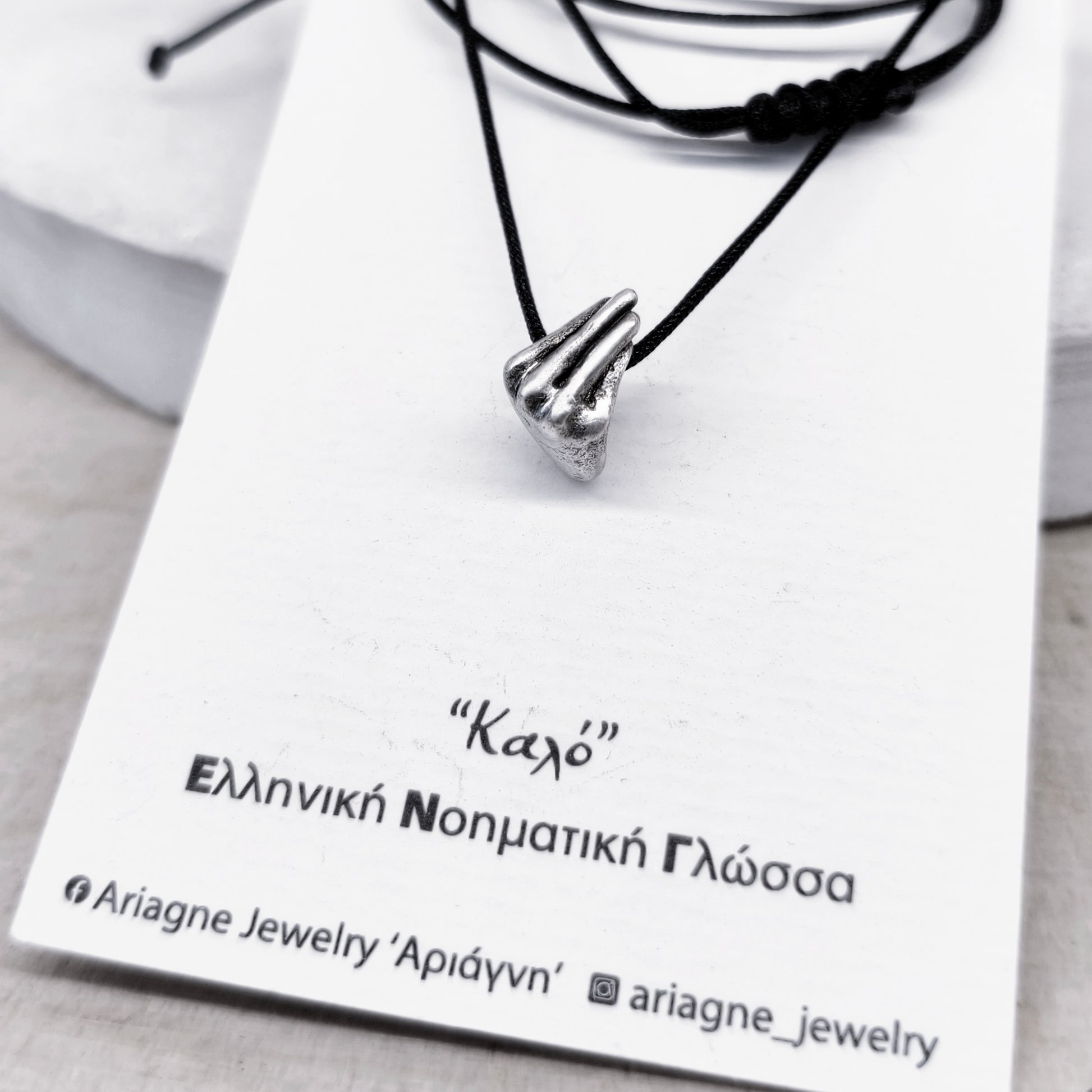 Ασημένιο(925°) κρεμαστό γούρι με τη χειρομορφή "καλό" για το νέο έτος, στην Ελληνική Νοηματική Γλώσσα, σε μαύρο κορδόνι το οποίο αυξομειώνεται.