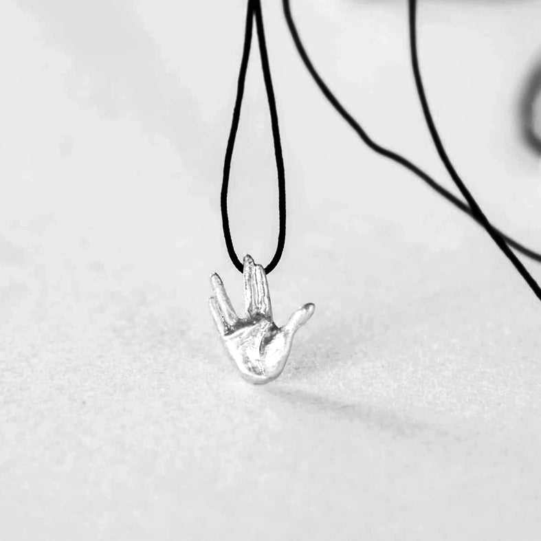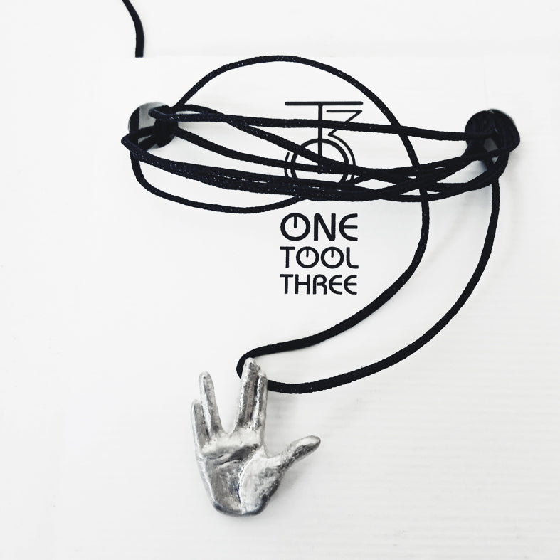 Ασημένιο (925°) μενταγιόν, χαιρετισμός Dr Spock, με μαύρο κορδόνι που αυξομειώνει.