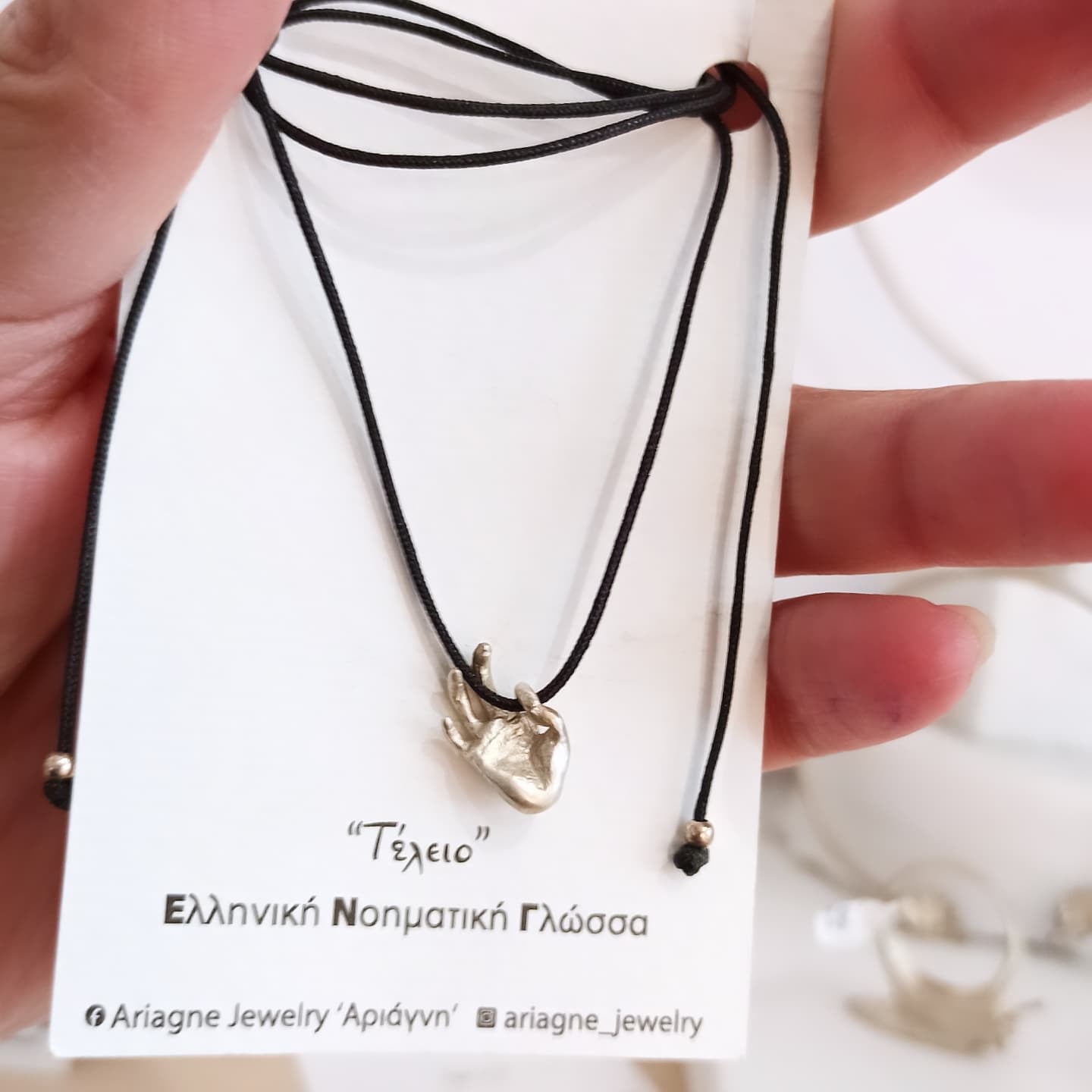 Ασημένιο(925°) κρεμαστό γούρι με τη χειρομορφή "τέλειο" για το νέο έτος, στην Ελληνική Νοηματική Γλώσσα, σε μαύρο κορδόνι το οποίο αυξομειώνεται.