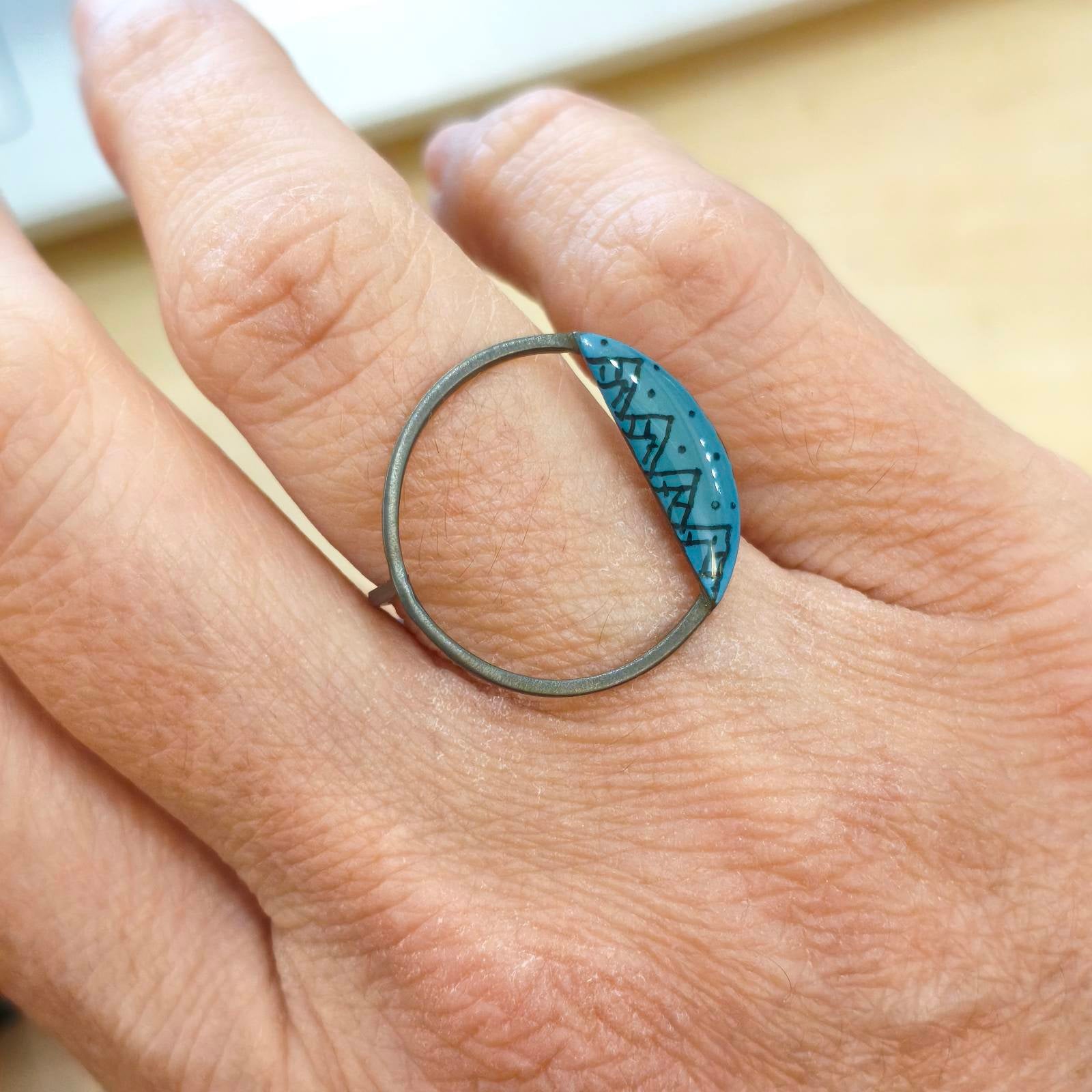 Ασημένιο, επιπλατινωμένο δακτυλίδι με σμάλτο και υγρό γυαλί, ζωγραφισμένο στο χέρι. Μεγέθη κατόπιν παραγγελίας.